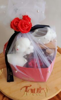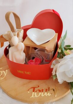 Le coffret Mia réunit beauté et élégance. Emballé dans un magnifique box en cœur rouge ou blanc, il est composé d’un brule parfum, avec au choix une brume ou une bougie en forme de couple ou une bougie en forme de buste, d’un pack de fondants parfumés, d’une bougie parfumée et une fiole d’allumettes